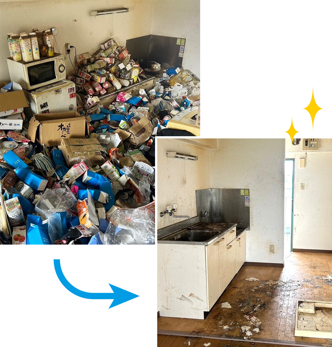 合わせて清掃やハウスクリーニングも可能です。大量のゴミの山となったゴミ屋敷状態のお悩みについてお気軽にご相談ください。